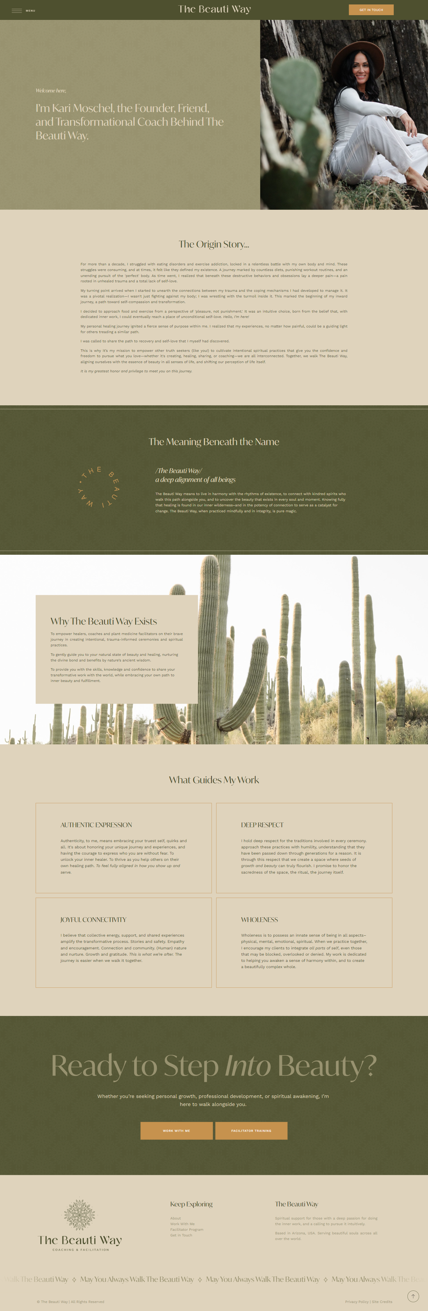 The website embodies the essence of The Beauti Way, exuding a calm, nurturing, and spiritually enriching environment that mirrors the safe, welcoming space Kari creates for her clients. The design reflects her commitment to guiding others through intentional, beautiful transformations and serves as a virtual home that resonates with her refined vision.